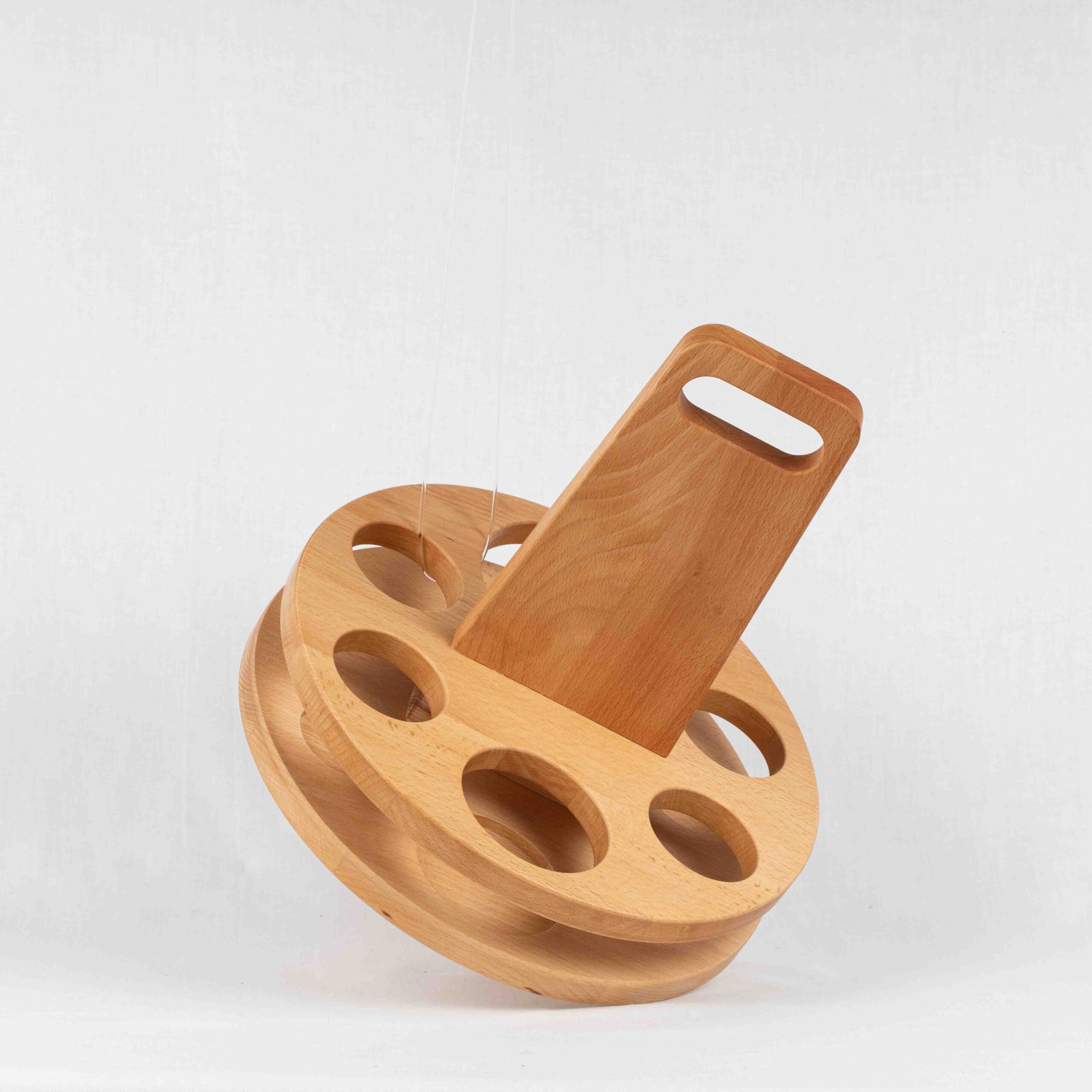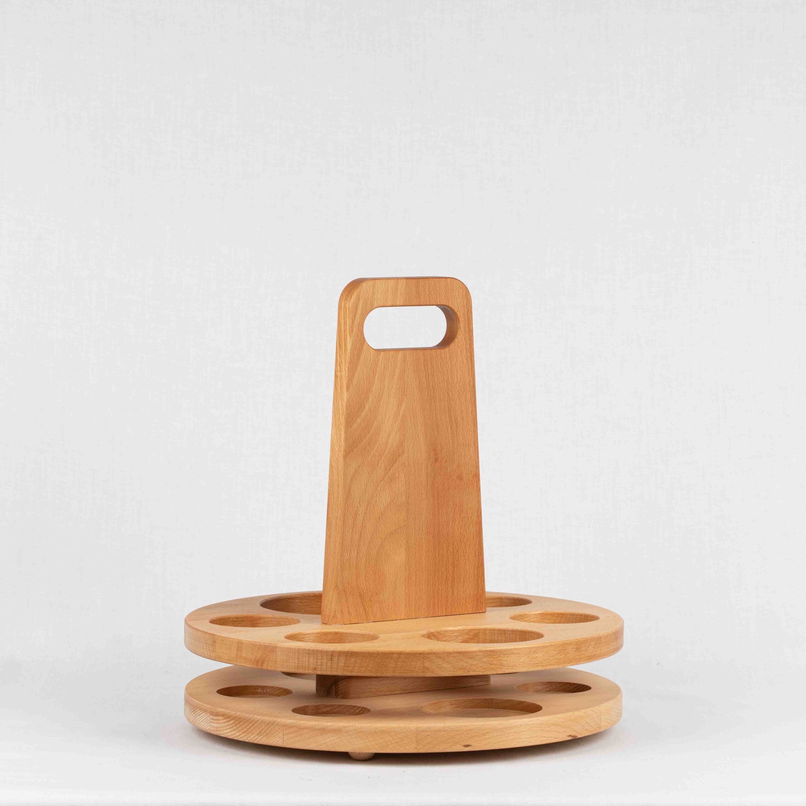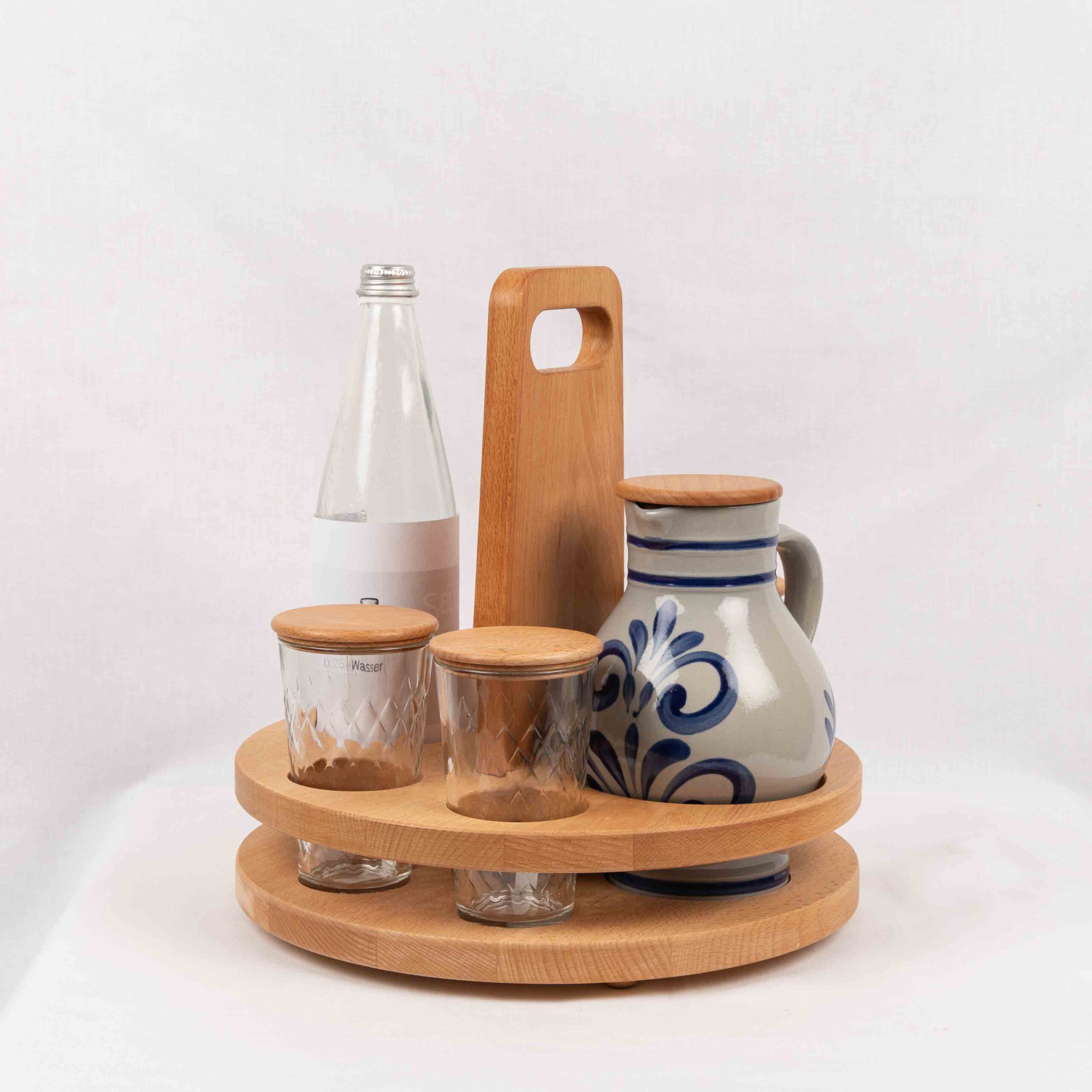Dieser elegante, runde Apfelweinträger aus geöltem Buchenholz bietet Platz für einen 1-Liter-Bembel, eine Flasche (Wasser) und vier 0,25 l Gerippte. Der mittig angebrachte Tragegriff sorgt für eine komfortable Handhabung und macht ihn zu einer praktischen Servierhilfe für gesellige Anlässe.