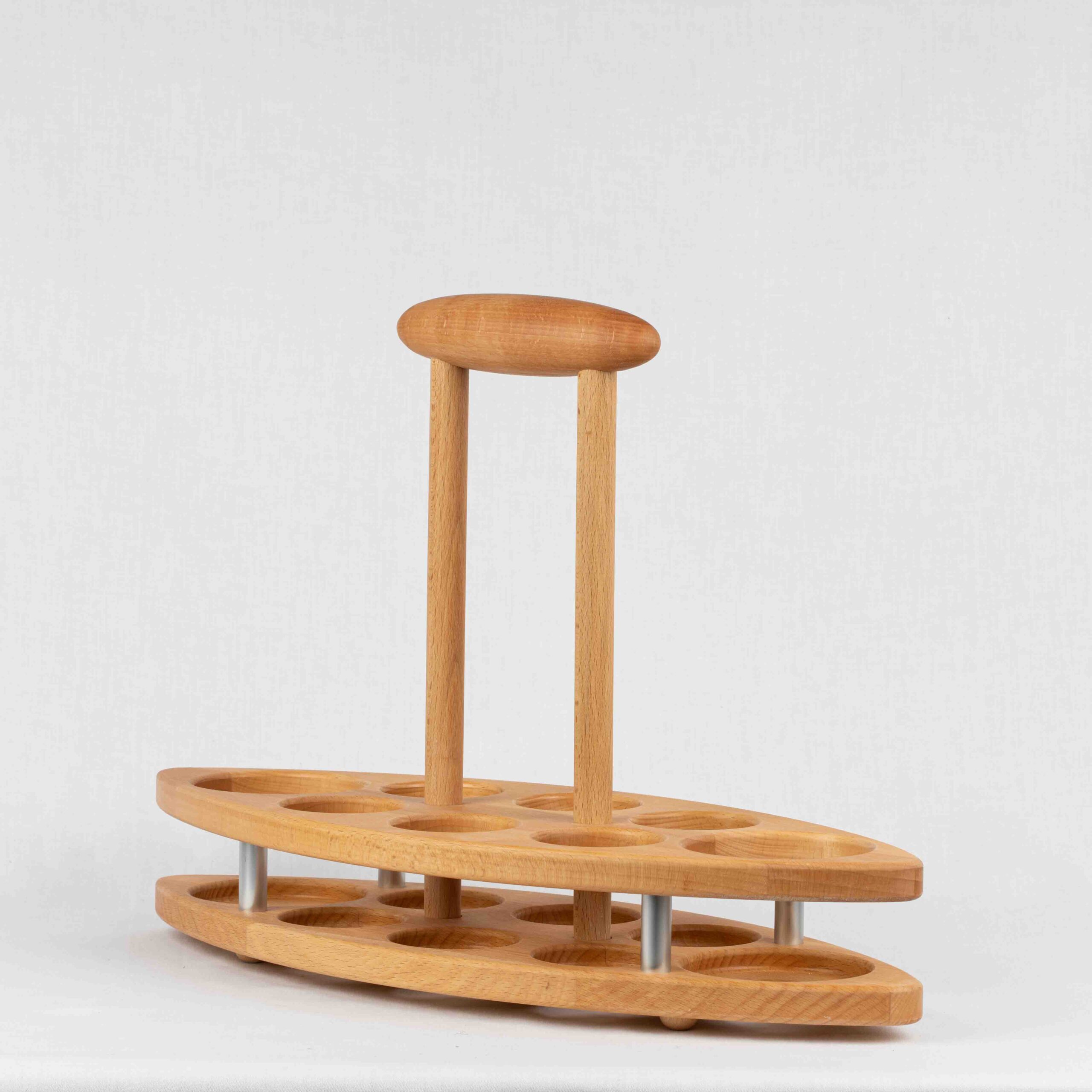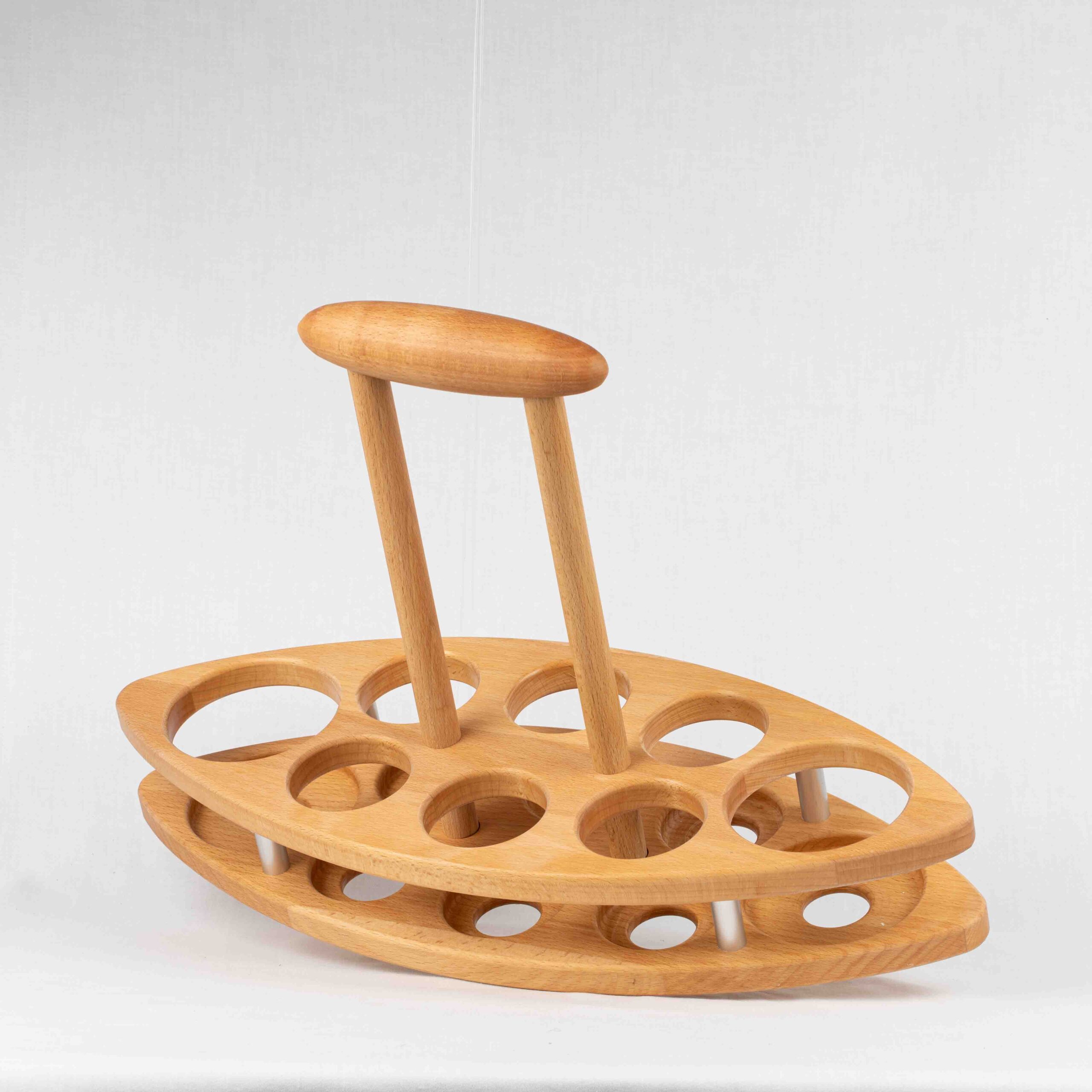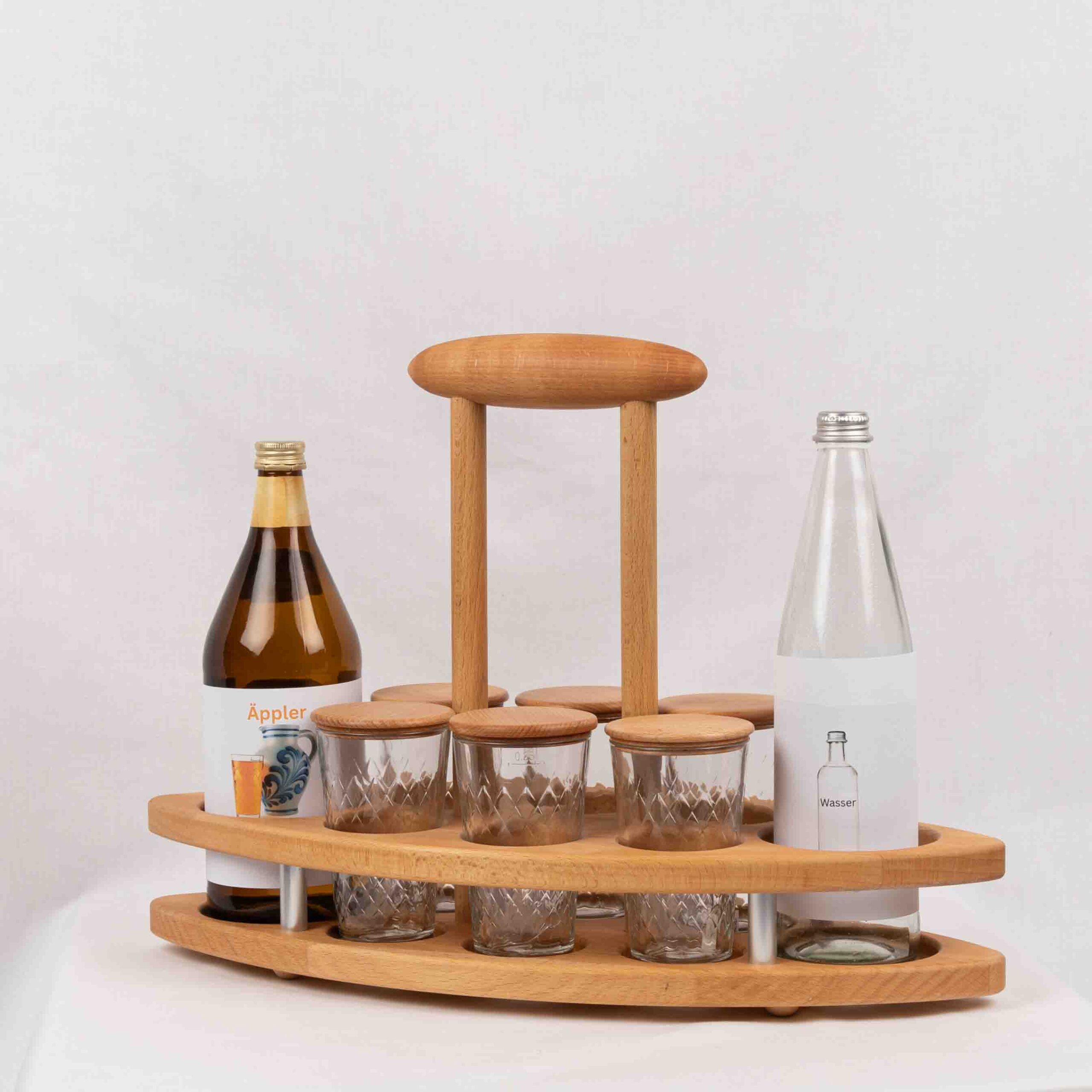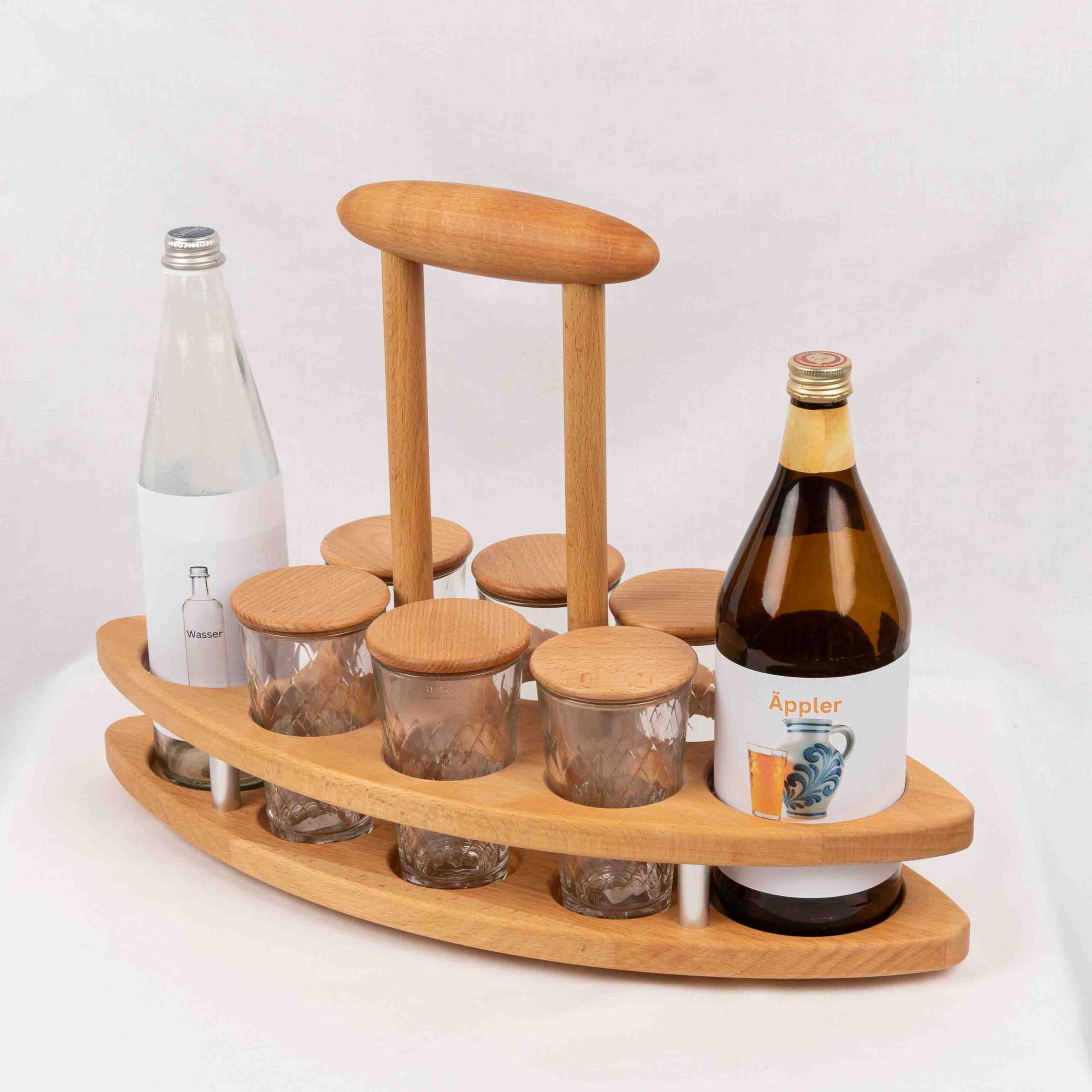 Dieser stilvolle Apfelweinträger in formschöner Schiffchenform aus geöltem Buchenholz bietet Platz für zwei Flaschen (Äppler und Wasser) sowie sechs 0,25 l Gerippte. Der mittig angebrachte Tragegriff sorgt für eine bequeme Handhabung und macht ihn zu einer praktischen Servierhilfe für jedes Event.