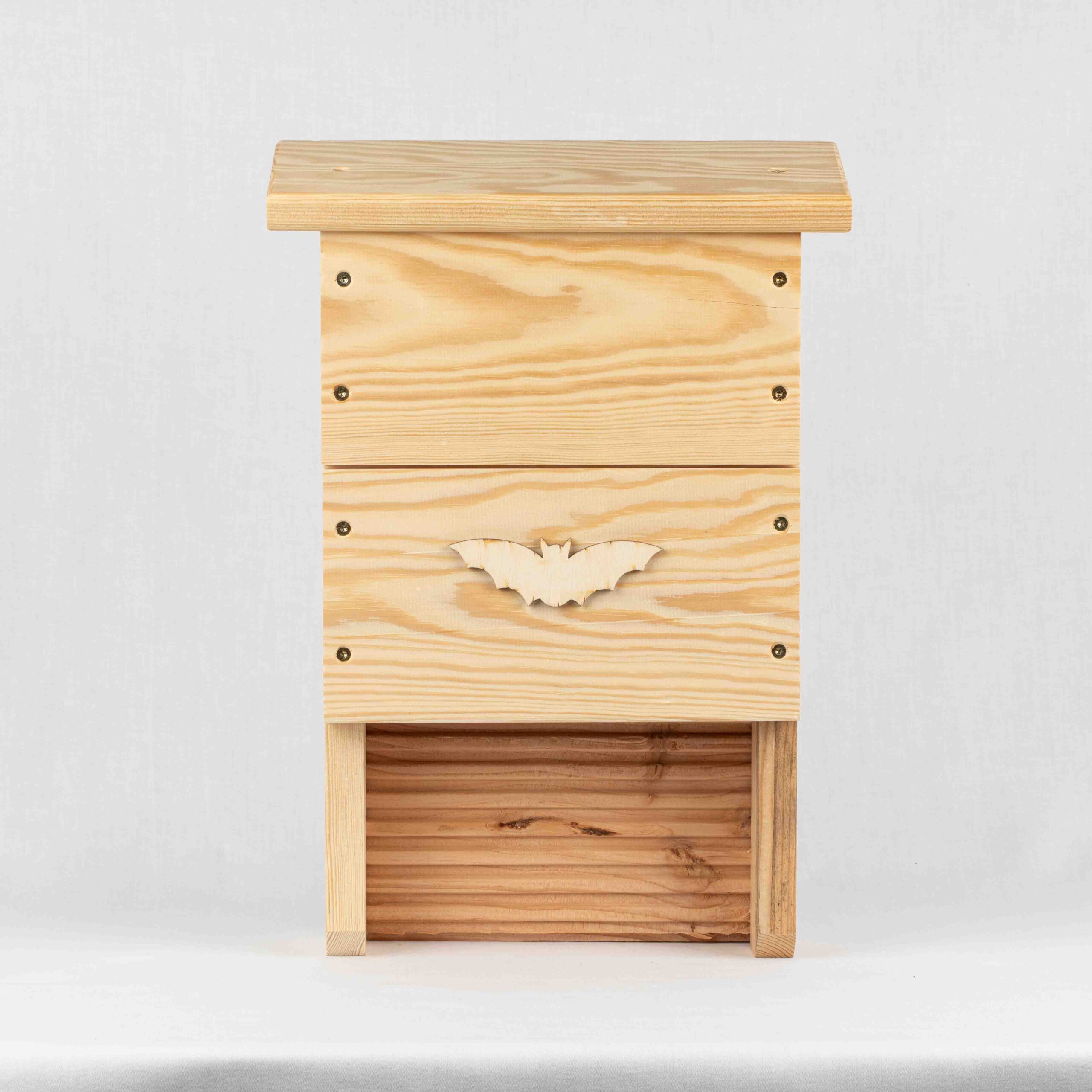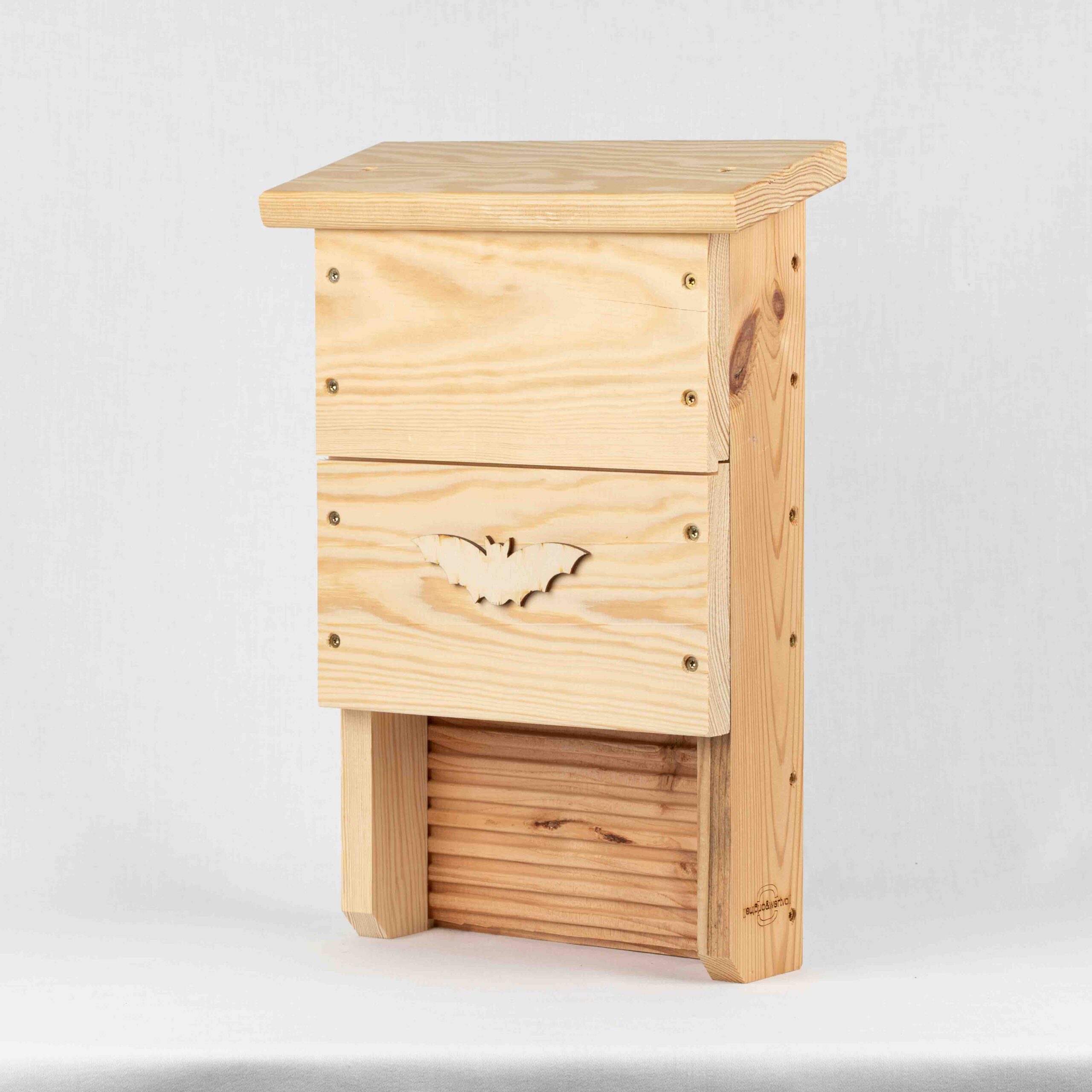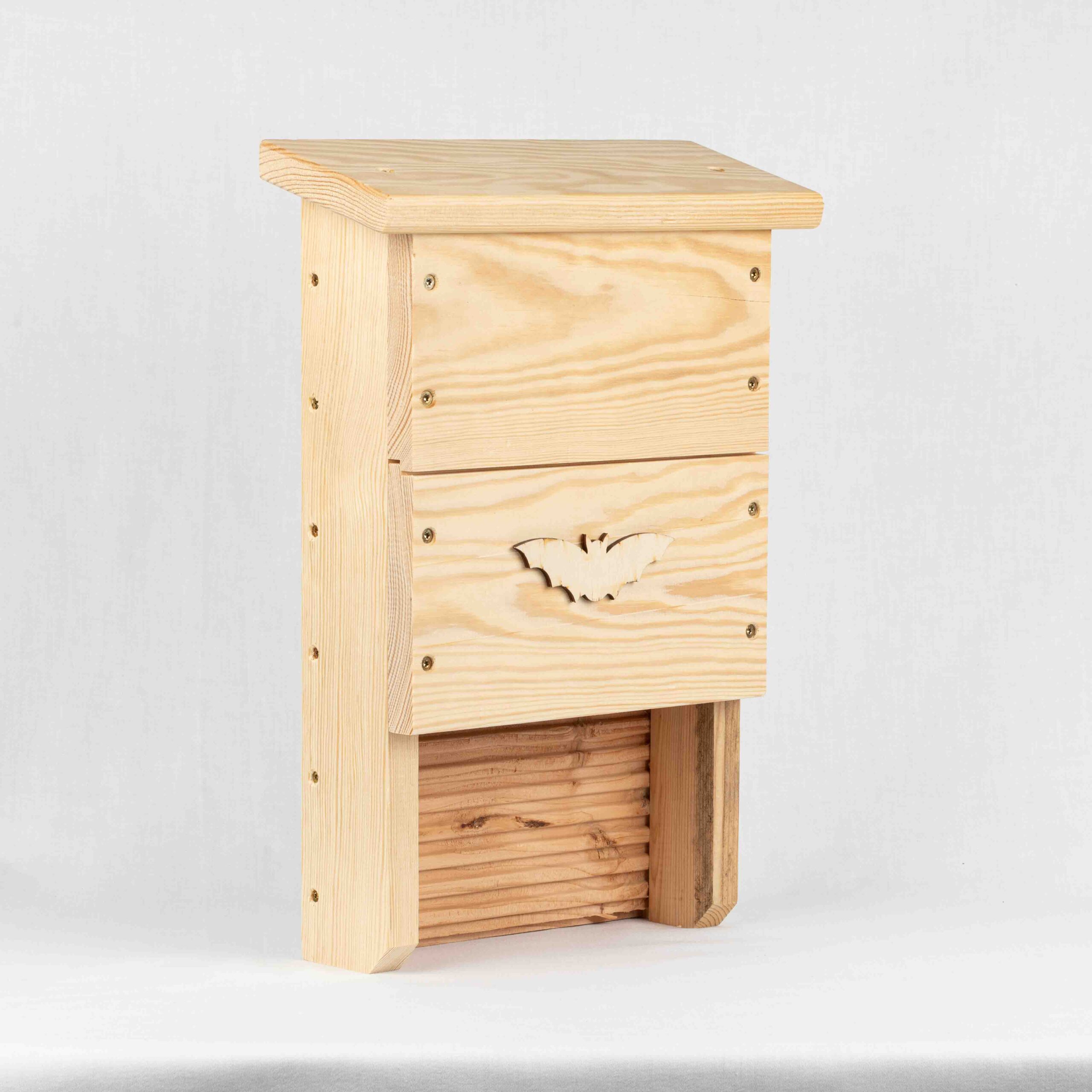 Diese Nisthilfe aus unbehandeltem Nadelholz wurde nach den Vorgaben des NABU gefertigt. Die geriffelte Rückwand bietet den Fledermäusen zusätzlichen Halt, während die Einflugöffnung an der Unterseite den Zugang erleichtert. So entsteht ein idealer Brutraum für Fledermäuse.