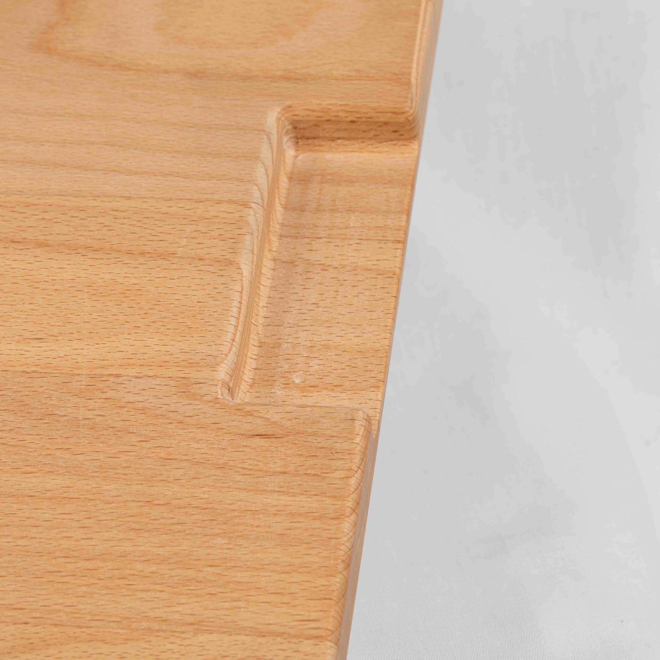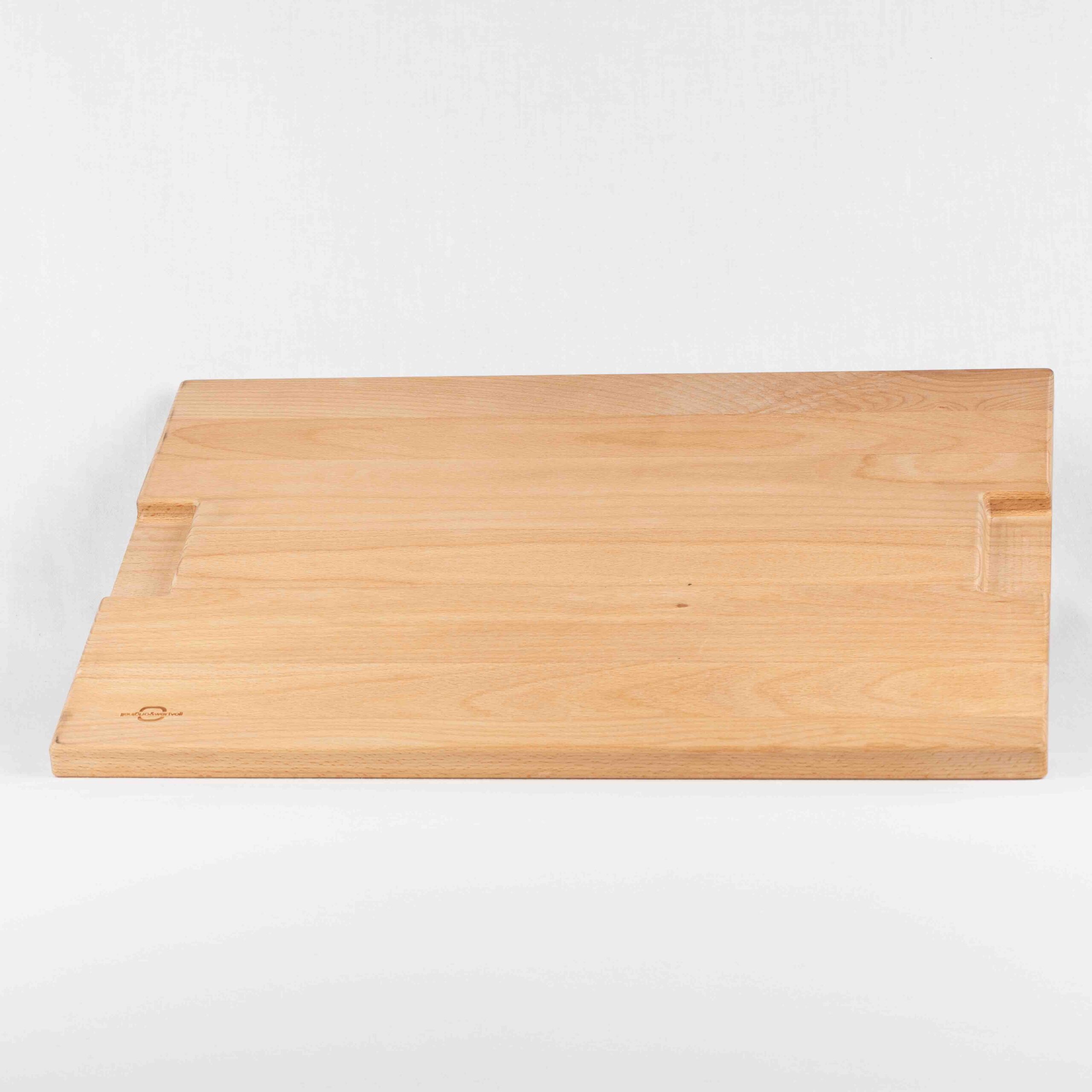 Dieses Pizzabrett in Buche ist angepasst an die Größe eines Backofenblechs und bietet daher Platz für eine gesamt Familienpizza. Die Oberfläche ist behandelt mit lebensmittelechtem Chestnutöl. Seitlich sind zwei Griffmulden eingefräst, die das Anheben des Brettes erleichtern.