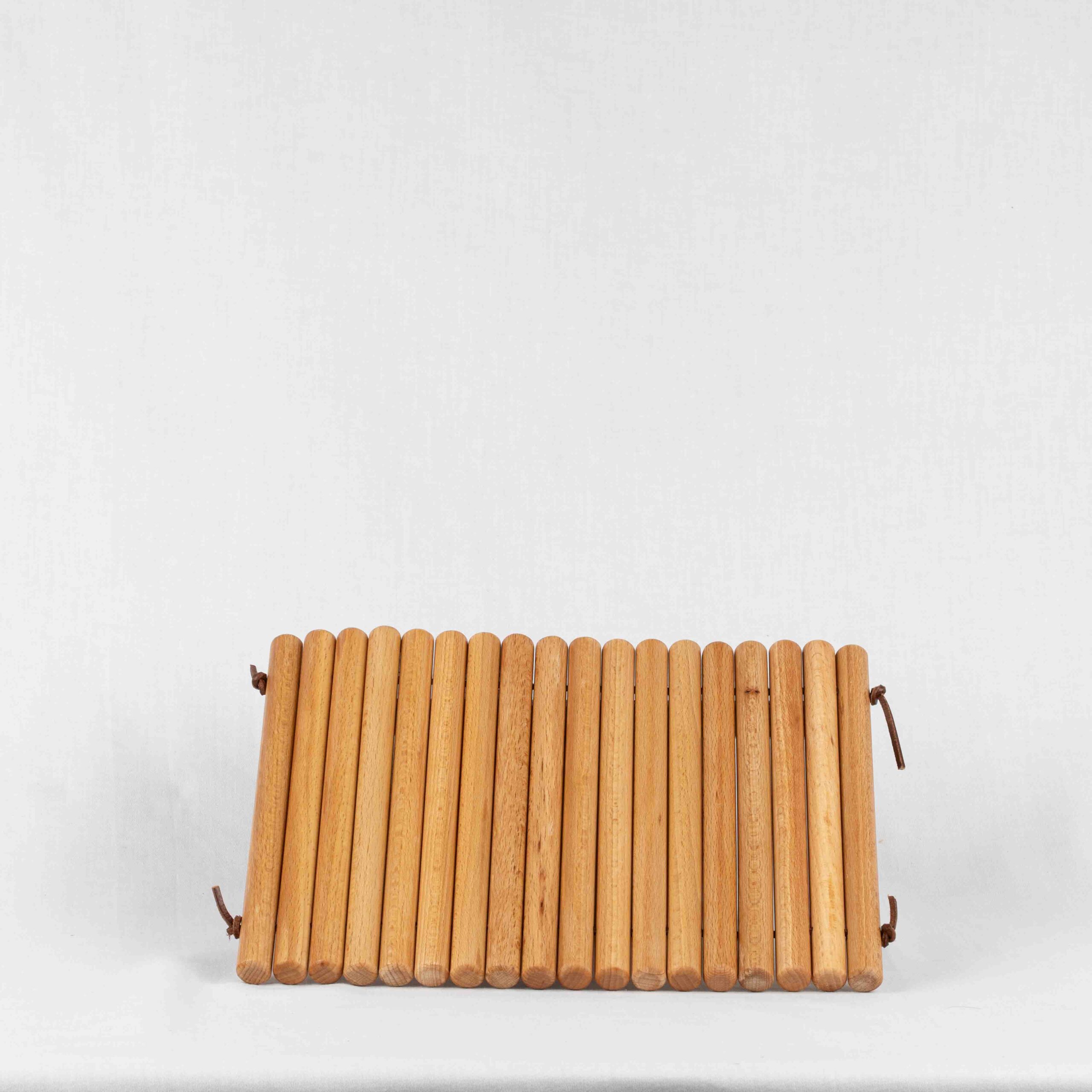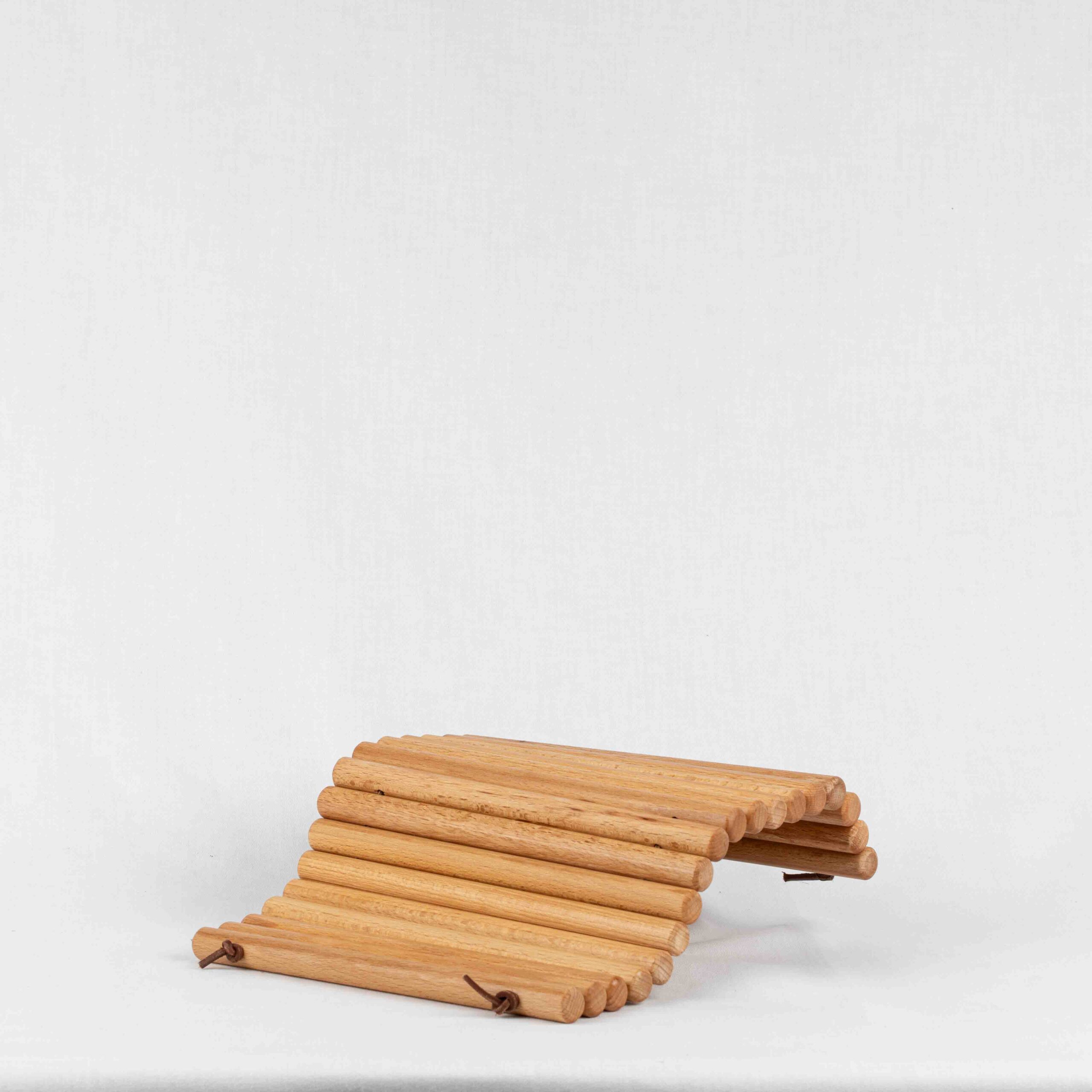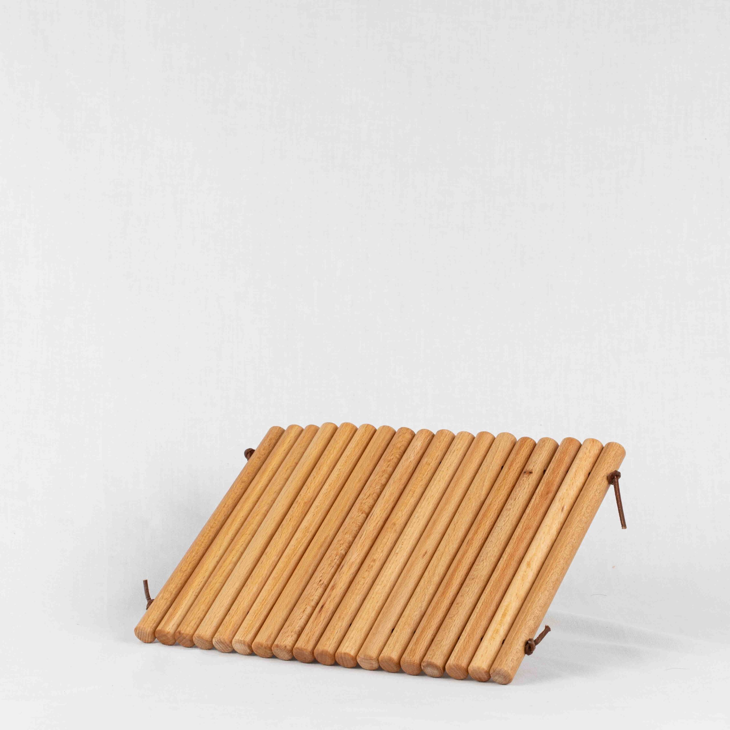 Dieses praktische und ansprechende Upcycling-Produkt schützt zuverlässig die Tischfläche beim Abstellen von heißen Töpfen und Pfannen. Die sorgfältig aufgefädelten Rundholzreste bestehen aus robustem Buchenholz, das für seine Langlebigkeit und Wärmebeständigkeit bekannt ist.